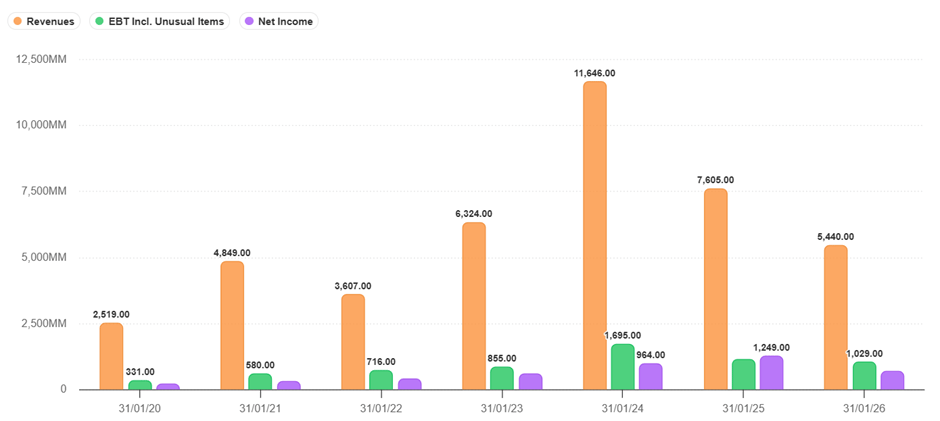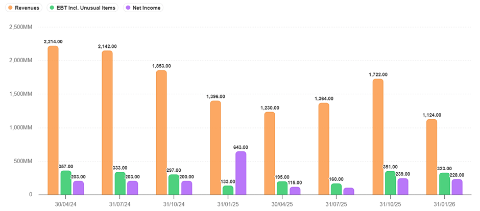 At a glance, the Revenue and Profit trend would seem concerning, where revenue declined from about RM11.6 bil at the peak in 2024 to a low of RM5.4 bil in 2026 and net profits declined from about RM960 mil to RM680 mil in the same period.